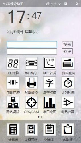 作为电子工程师,在开发过程中总需要各种各样的小工具,每次找起来就蛋疼,现在发布一款“MCU超级助手”工具软件,软件功能强大,单个文件,支持WIN7,WIN8,WIN10。详细描述见下文,个个应用简洁但不简单!