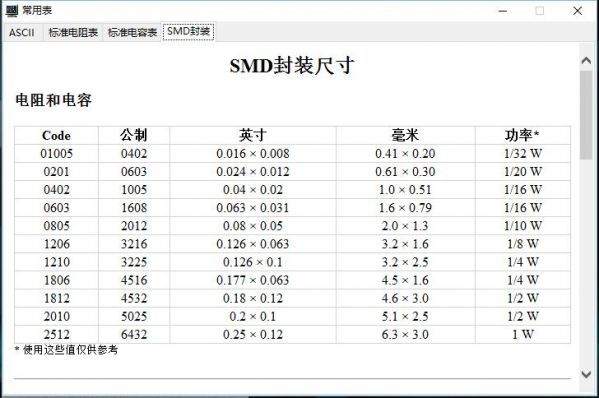 包含开发者常用的表格,包括ASCII表、标准电阻表、标准电容表、SMD封装表,方便工程师查询。