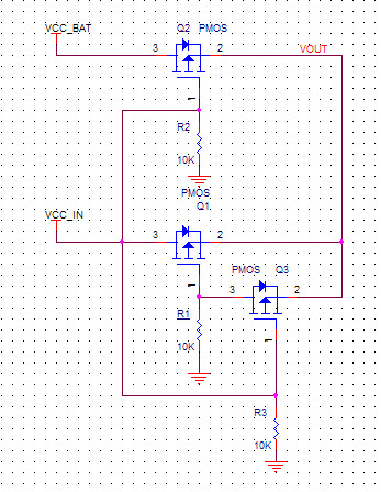 说明下场景:VCC_BAT电池供电;VCC_IN外部供电,其没有接外部电时,有电池供电;没接负载,考虑VCC_IN经过MOS后的压降一般也比VCC_BAT大