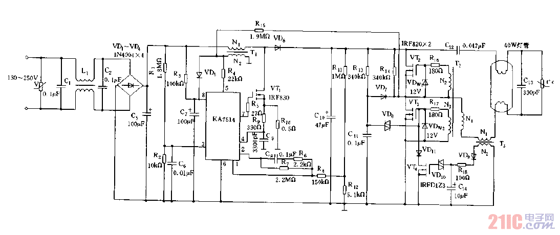 KA7514控制的40W荧光灯的电子镇流器电路图