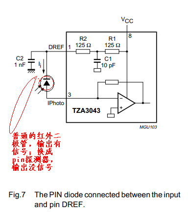 互阻抗放大器tza3043 ,依照数据手册给的电路图搭建,用普通的红外光电二极管接受,输出有信号。但是将普通的红外对管光电二极管换成PIN红外探测器,输出没有信号。百思不得其解。知道论坛里的高人多,能指导一下吗