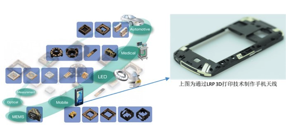 LRP指通过三维印刷工艺,将导电银浆高速精准地涂敷到工件表面,形成天线形状,然后通过三维控制激光修整,以形成高精度的电路互联结构。