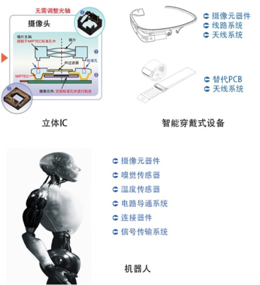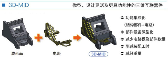 基于3D激光的3D-MID技术可广泛运用于移动通讯,手持互联网设备,精密仪器,医疗设备,汽车、航空等众多领域,能够有效减小产品体积,提高可靠性,为产品创新提供有力支持。3D-MID技术最初提出在80年代初期,直至2005年之后才开始大规模应用,国内包括泛友科技有限公司,同拓光电有限公司等都成功研发具备自主知识产权的3D-MID技术。