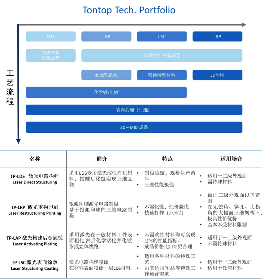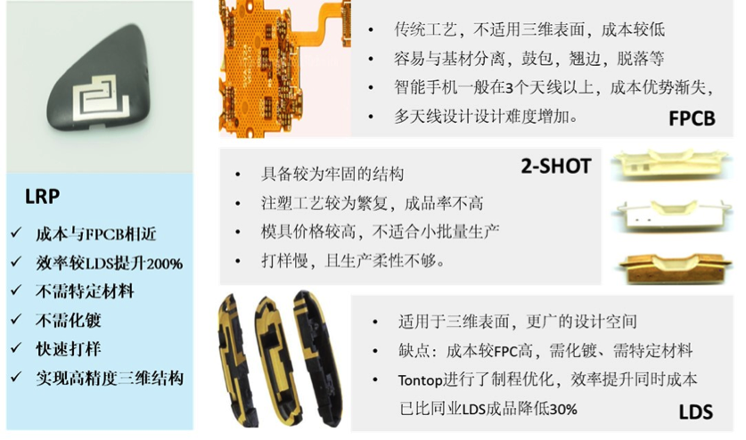 与现在流行的3D打印概念不一样,3D-MID技术的LRP(激光重构印刷)是适用于大规模量产的基于3D激光的3D打印技术,与传统的量产工艺对比,具备明显优势:
