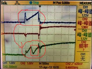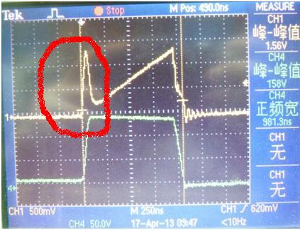 CH1:IQ(10Ω取样电阻RS1)CH2:VS但是图中,在MOSFET开通的初始时刻,出现一个峰值电流,该电流从何而来?
