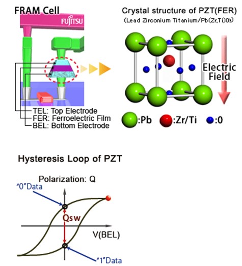 关于铁电介质下面的图表解释了PZT晶体结构,这种结构通常用作典型的铁电质材料。在点阵中具有锆和钛,作为两个稳定点。它们可以根据外部电场在两个点之间移 动。一旦位置设定,即使在出现电场,它也将不会再有任何移动。顶部和底部的电极安排了一个电容器。那么,电容器划分了底部电极电压和极化,超越了磁滞回 线。数据以“1”或“0”的形式存储。