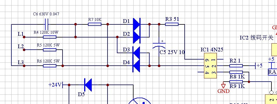 小弟费解了很久的电路。 L1 L2 L3是三相电源输入端, 系统供电是由L1 L2通过变压器整流得到。 4N25 是个光耦(原理图估计是抄板的来的) 。 光耦输出的信号由单片机检测。 产品是个三相电机控制系统。