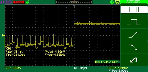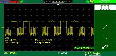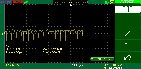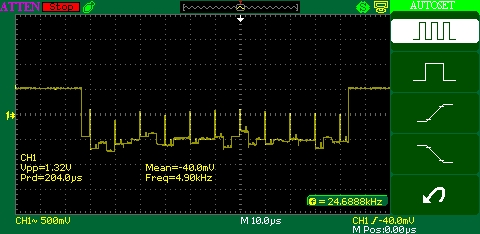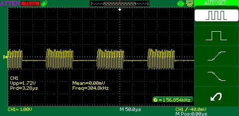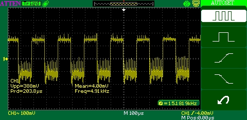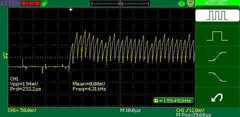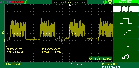 输入是158mV的模拟采集信号其实是0064芯片处理后32通道信息的差分信号,差分信号分P/N ,这是其中的1路P;实际波形是接近方波但有很多类似毛刺的波形,频率4.9KHZ.