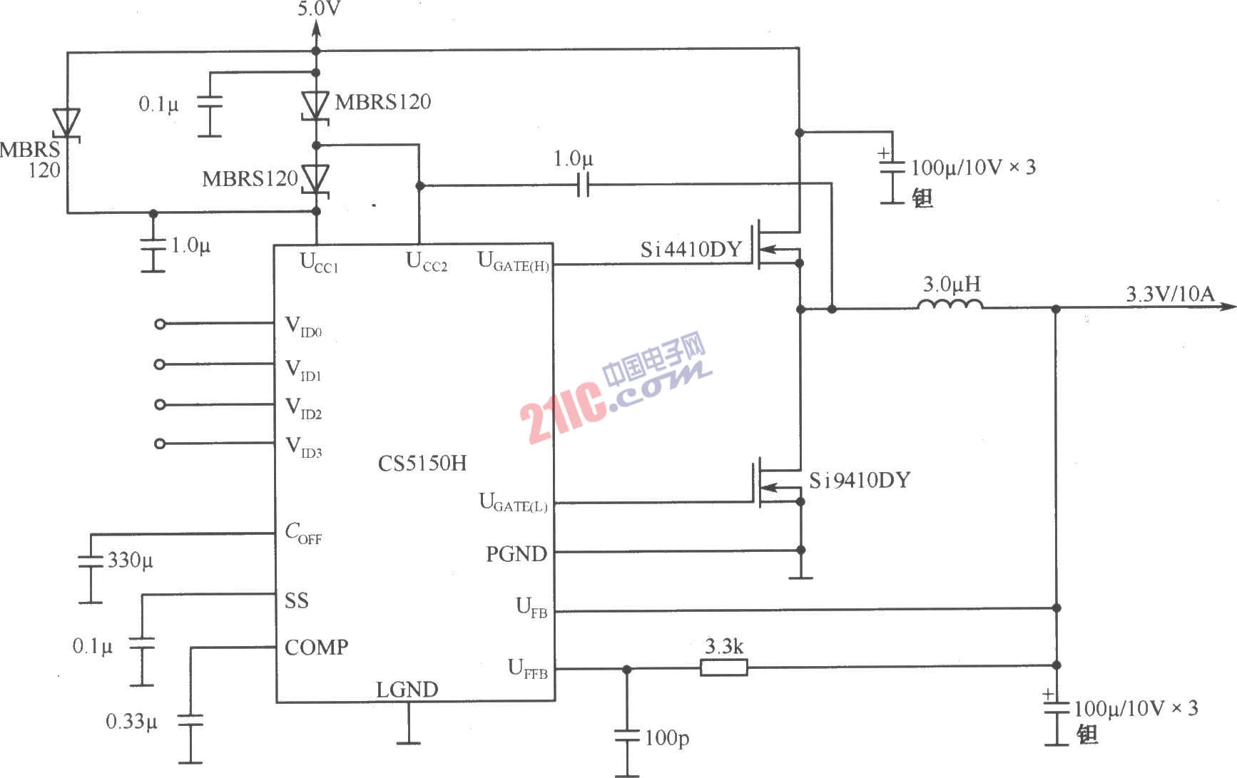 4位编码同步降压控制器CS5150H构成的5.0V至3.3V/10A变换器