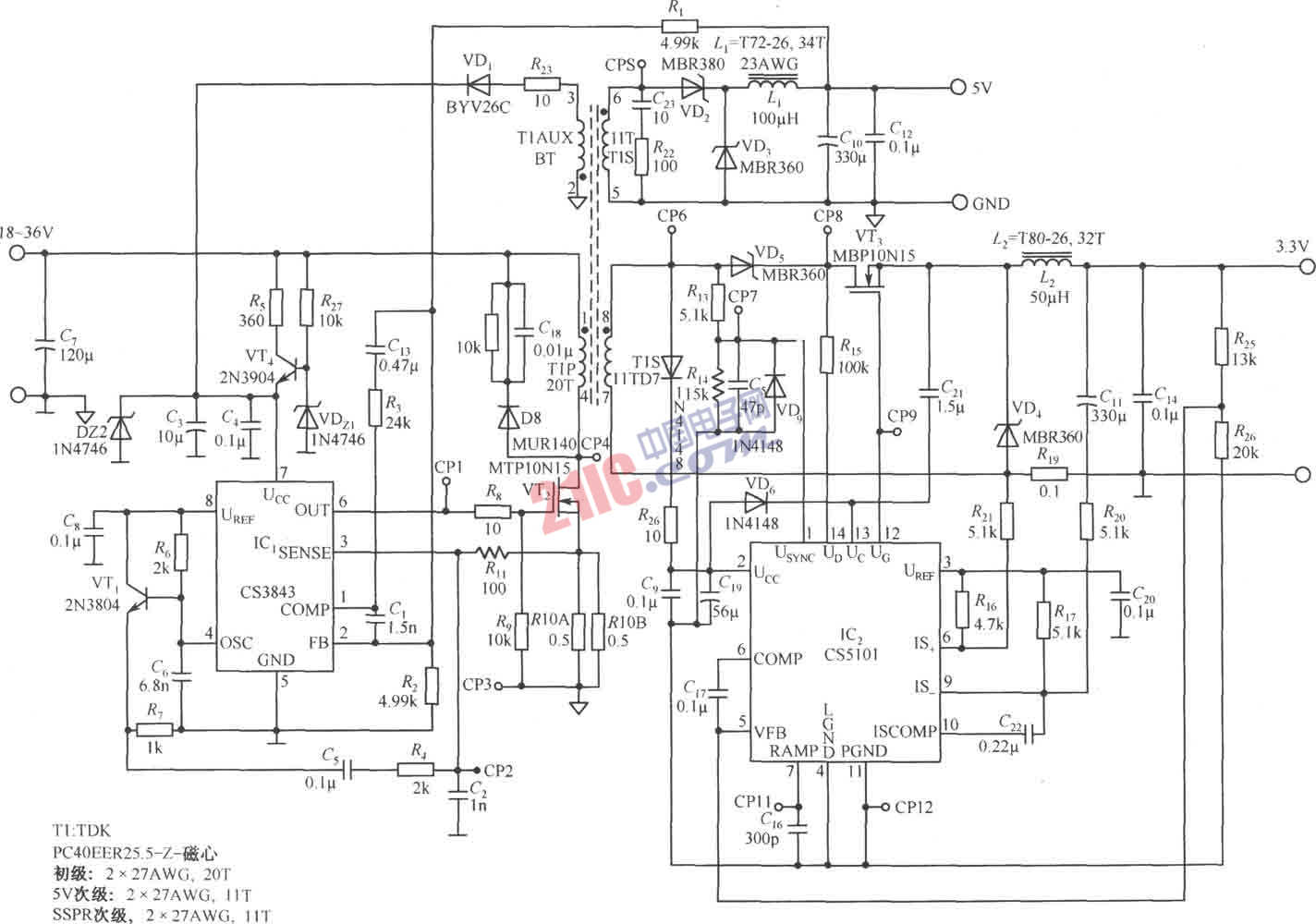 由CS3843和CS5101构成的输出为5V/3.3V的开关直流稳压电源电路如图所示。CS3843是一个频率固定的PWM控制器。这种集成电路的特点是有一个调定的振荡器,用来精确地控制占空比,有一个经过温度补偿的基准电压,一个高增益误差放大器、电流检测比较器和一个适用于驱动功率管MOSFE的大电流推挽输出端。CS5101是一个双极性次级边末级稳压器,稳压精度可达1.0%,栅极驱动电压为8.0~75V,工作电压(Ucc)为8.0~45V,有1.5A峰值输出电流。芯片内有一个精度为2.0%的精密电压基准和内补偿的误差放大器。