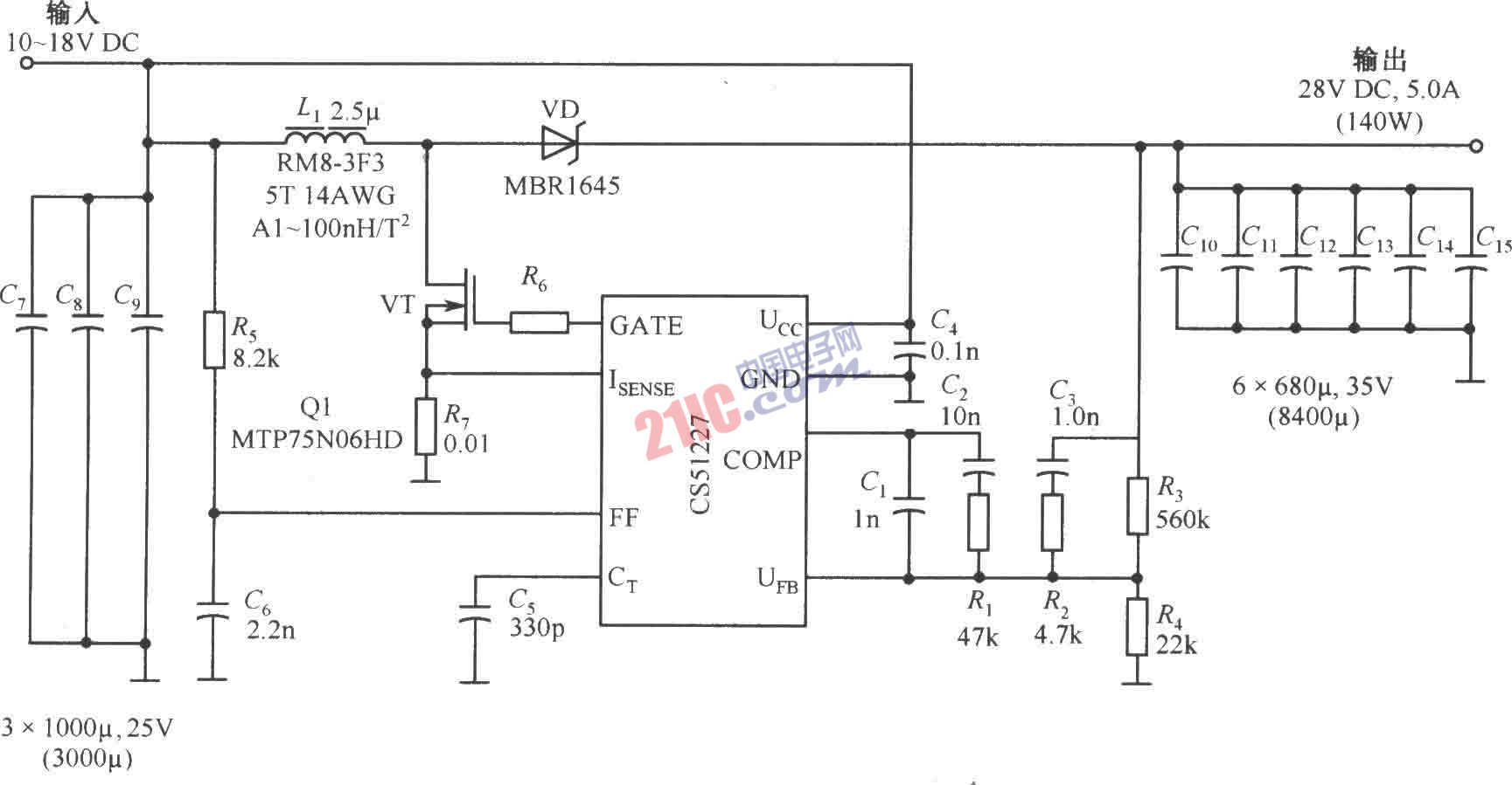 由CS51227构成的输出为28V/5A的直流稳压电源电路如图所示。CS51227是一个电压型PWM控制器,它的开关频率可达l.0MHz,启动电压为4.7V,启动电流为75μA。本电源输入电压为10~18V,输出电压为28V±1%,输出电流为0~5A,开关频率250kHz,输出电压纹波150mVp-p,效率90%。