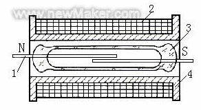 1-舌** 2-线圈 3-玻璃管 4-骨架 当线圈通电后,管中两占**的自由端分别被磁化成N极和S极而相互吸引,因而接通被控电路。线圈断电后,干 簧 在本身的弹力作用下分开,将线路切断。
