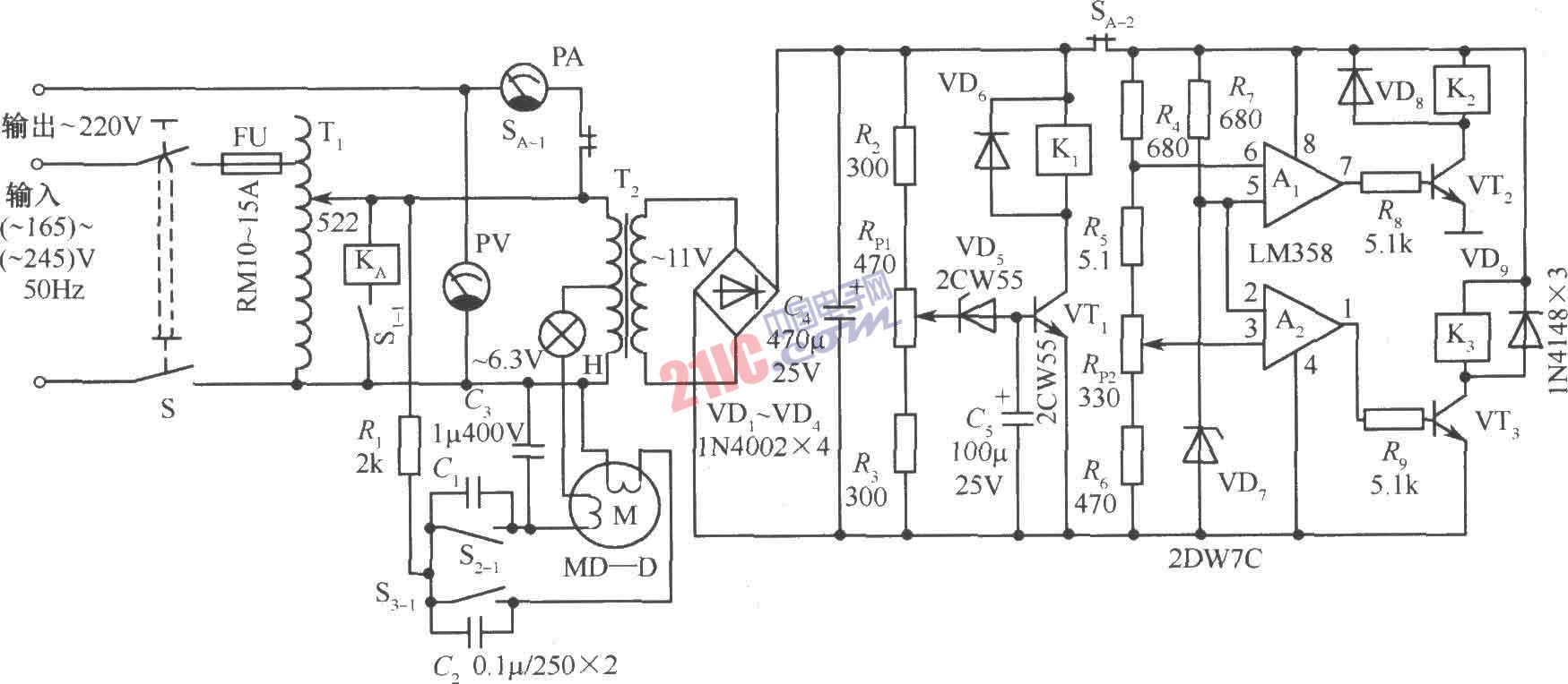 这是一种由交流伺服系统控制的全自动交流稳压电源。当输入电压或负载改变而引起输出电压变化时,它能迅速自动调整,使输出电篮稳定在220V。它适用的交流输入电压变化范围为165~245V,最大输出功率为3000W,最大输出电流可达3.6A,电源工作效率大于98%。其电路如图所示。