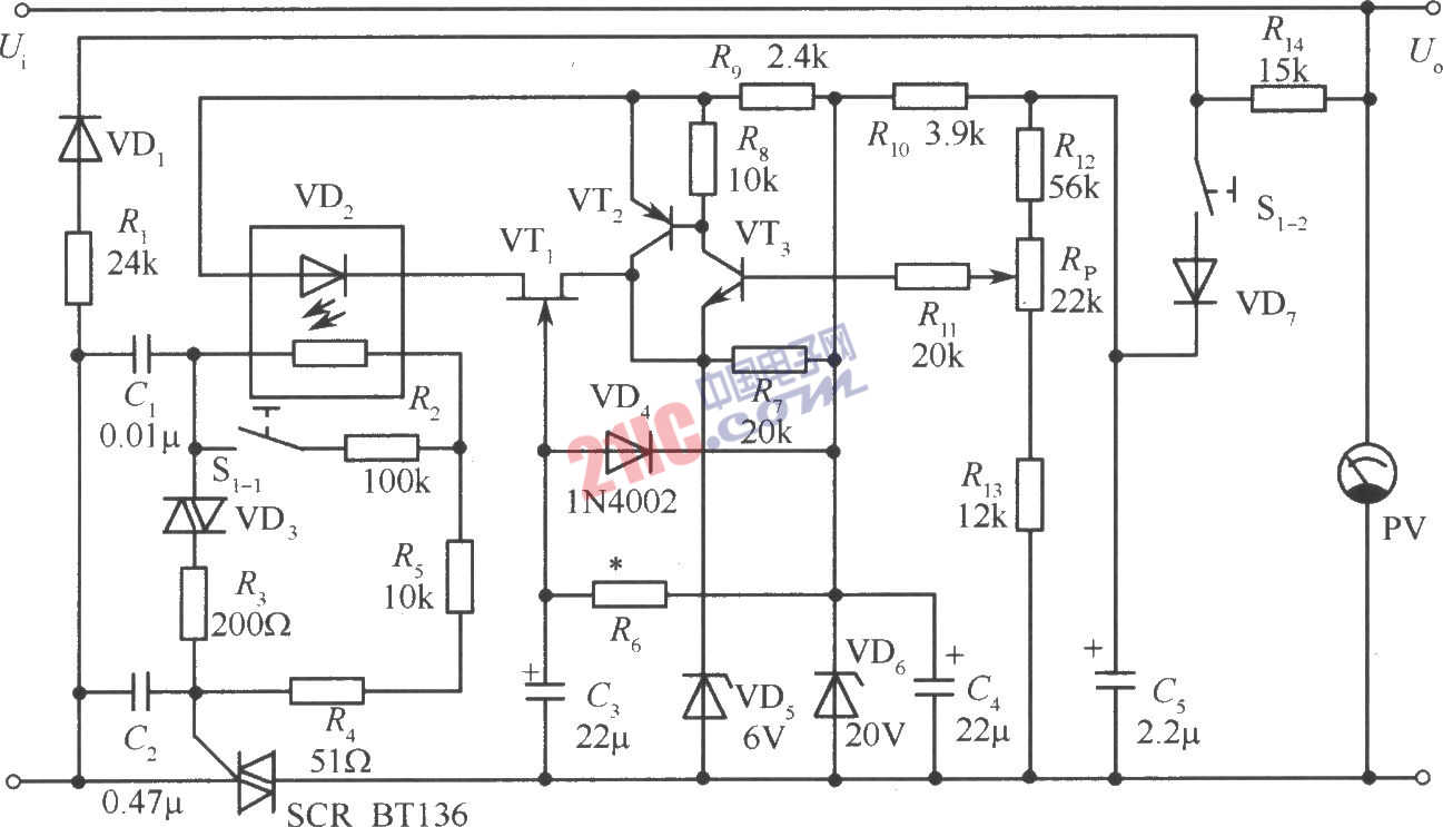 该电源电路原理如图所示。开关Sl闭合时,电流经负载及R5、R2和Cl组成的网络移相后,通过双向触发二极管VD3和触发可控硅SCR使其导通。由于R2电阻的阻值很大,故可控硅SCR的导通角较小。这时在输出端便可得到一个较低的电压(可设计为零,作为延时开启用)。