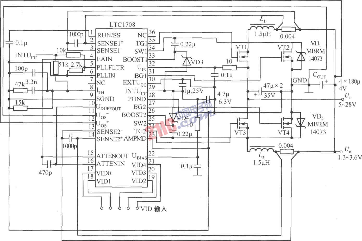 振荡频率=310kHz;VTl~VT4:FAIRCHILD FDS7760A;Ll~L2:SUMIDA CEP125-1R5M;COUT:PANAS()NIC EEFUEOG181R;VD3,VD4:CMDSH-3TR