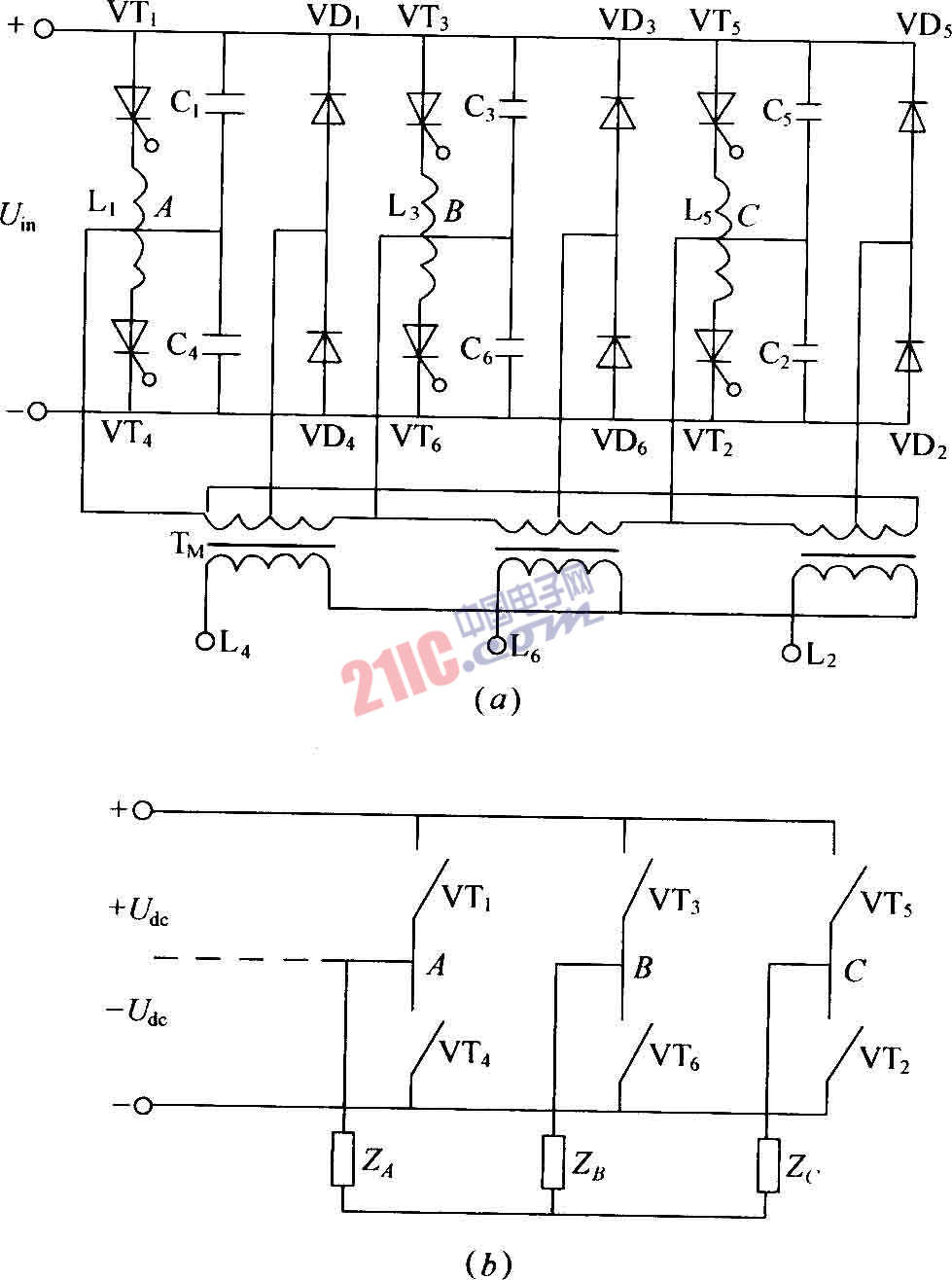 传统的三相桥式逆变器电路如图(a)所示。图中,VT1~VT6为晶闸管,L1~L6为换向电感,C1~C6为换向电容,两者组成晶闸管关断电路。VD1~VD6为反馈二极管。依据晶闸管工作原理,在三相交流输入电源作用下,若晶闸管承受最大正向阳极电压,而控制极又获得触发脉冲时便转入导通状态。反之处于导通状态的晶闸管在足够的反向阳极电压作用下会转为截止状态。图(b)为图(a)的简化图。