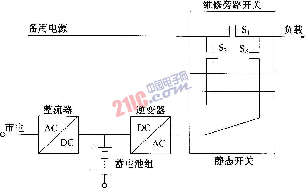 UPS电源依据逆变器组合方式可分为转换型和并机型,设置静态开关的单相转换型UPS电源主电路框图如图所示。由图可知,当市电正常时,以逆变器输出作为主用电源供给负载。为了便于维修,设置了一个手动维修旁路开关,即检修时先让旁路开关S,闭合,然后使S2、S3和静态开关断开。改由备用电源向负载供电,则UPS系统与旁路系统脱离,此时便可对逆变器、静态开关做维修。当逆变器作主用电源时,先合上静态开关和旁路开关S2、S3,再断开S1。