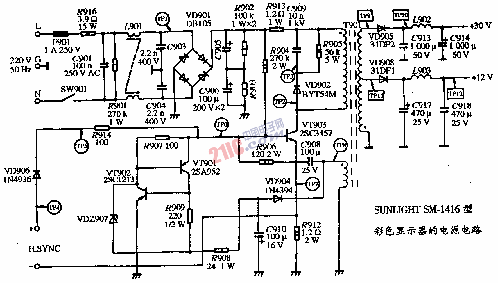 SUNLIHT SM-1416型彩色显示器的电源电路图