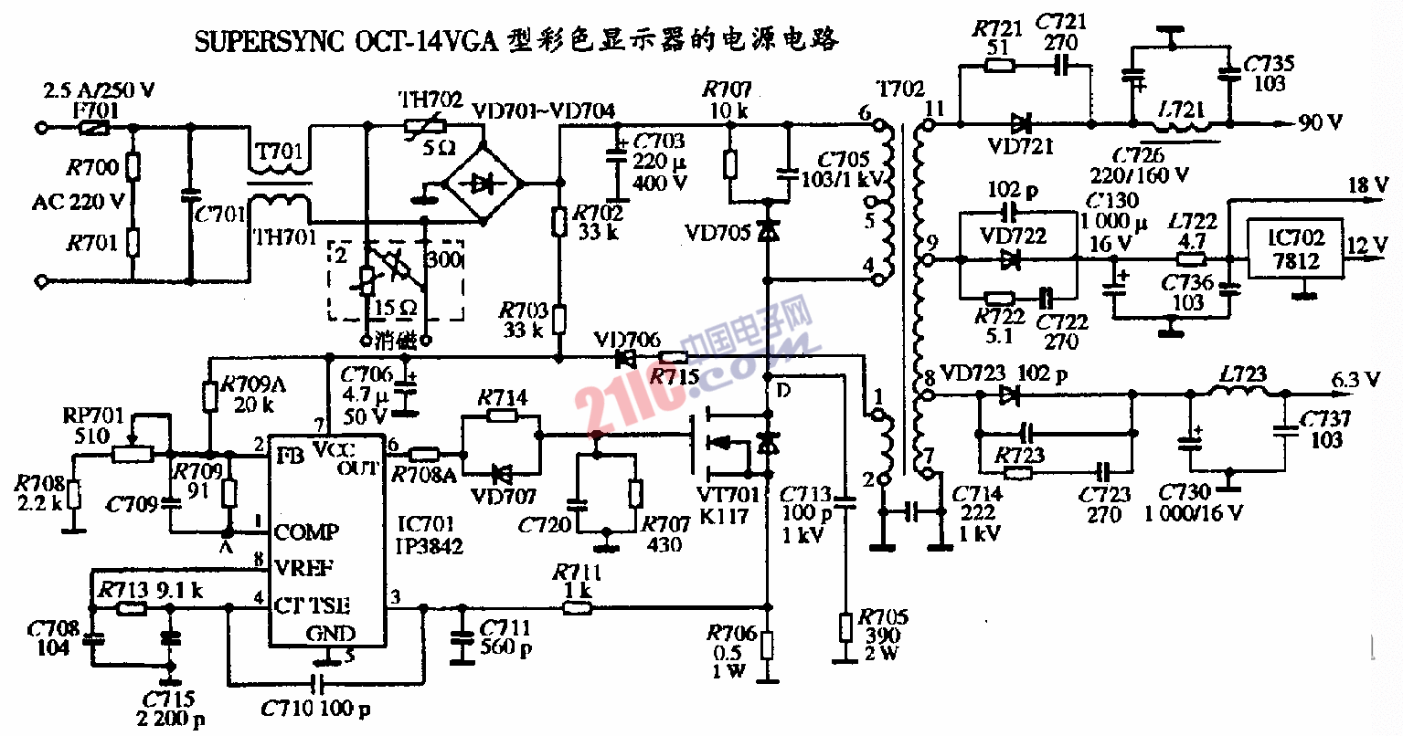 SUPERSYNC OCT-14VGA型彩色显示器的电源电路图