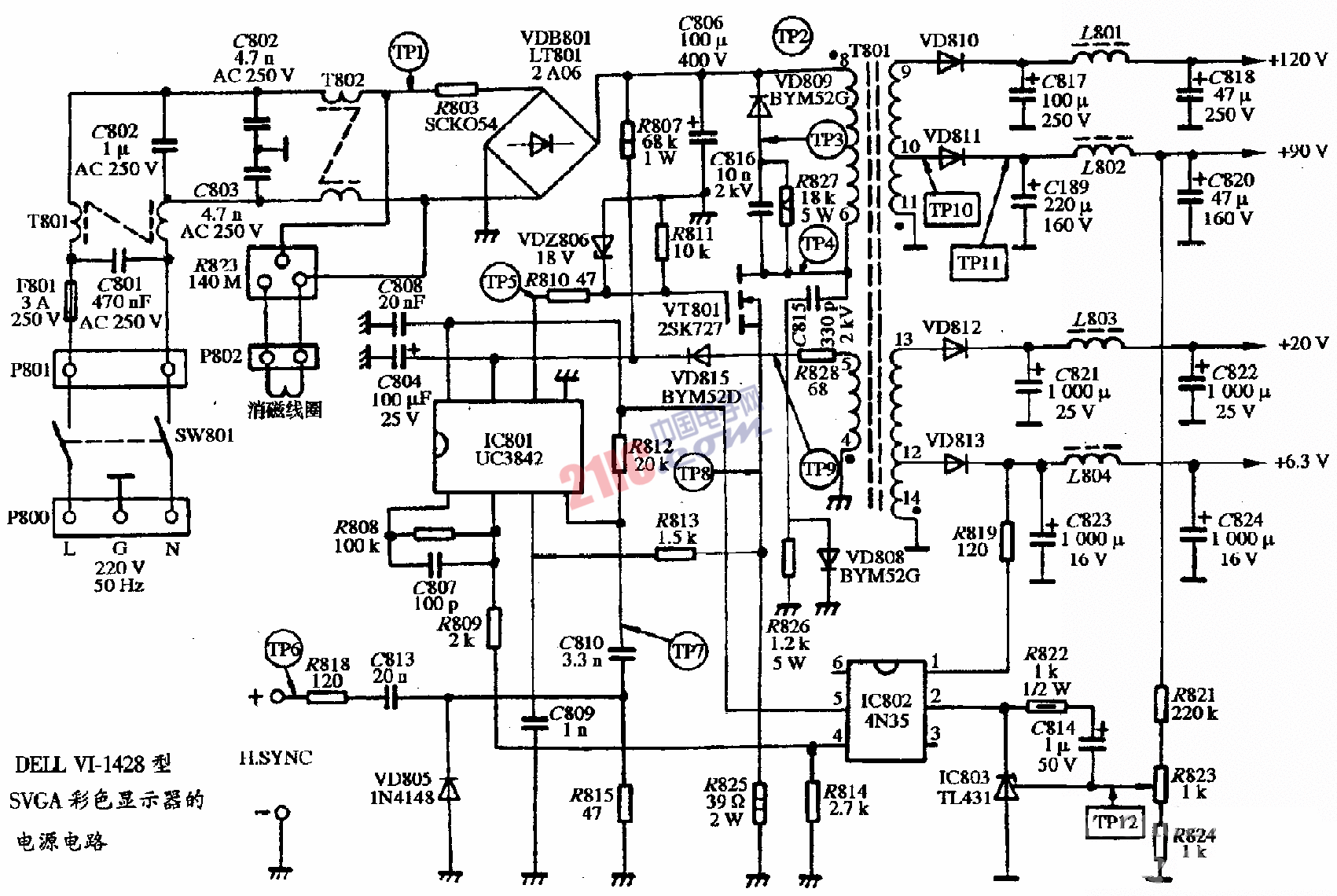 DELL VI-1428型SVGA彩色显示器的电源电路图