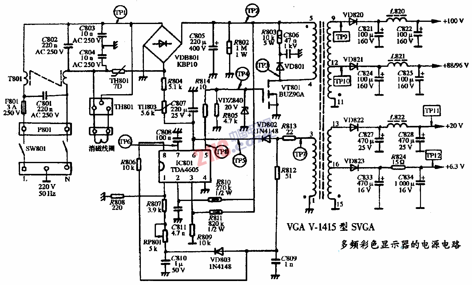 VGA V-1415型SVGA多频彩色显示器的电源电路图