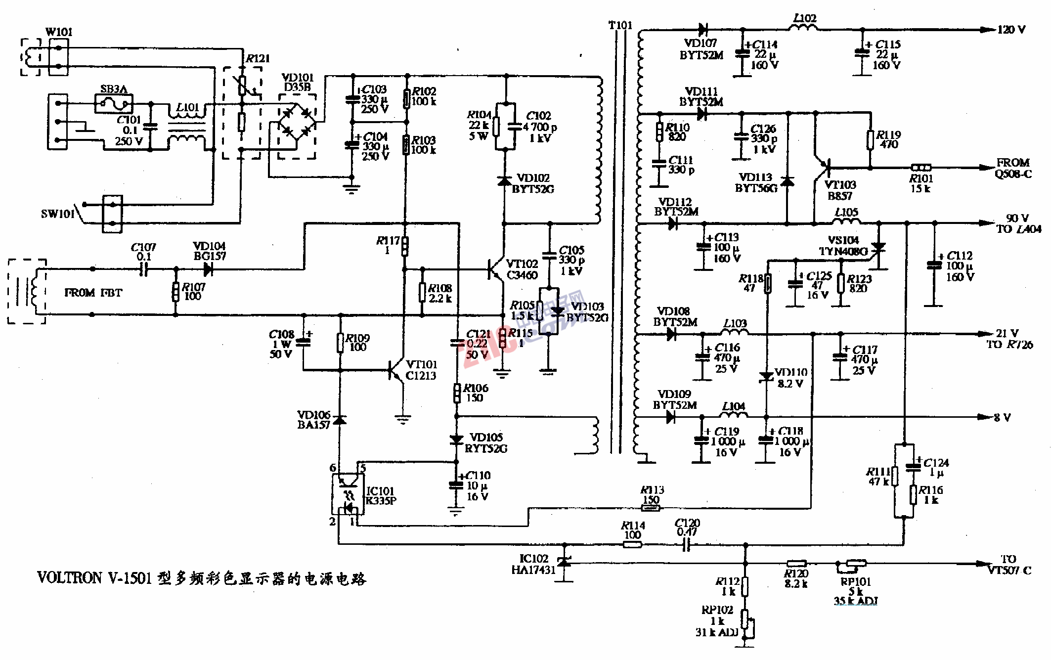VOLTRON V-1501型多频彩色显示器的电源电路图
