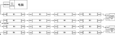 按照上图所示,用2102E信号转换器、RS232标准的信号转换为RS485,每32个智慧型变色管就要用一个中继电源,这样将其一个一个连接起来。四芯转换电线是用来传输信号,也可以用来切断电源,以避免两个供电电源器产生冲突: