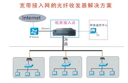 用户接入网利用光纤收发器带有的网管功能,可以对每一个分散用户点进行集中管理,光纤收发器的10Mbps/100Mbps自适应及10Mbps/100Mbps自动转换功能,为用户提供足够的带宽。也可以利用链路失败告警(LFA)功能,在点对点的传输中相互监控来代替集中网管功能,降低接入成本,同时利用半双工/全双工自适应及半双工/全双工自动转换功能,可以在用户端配置廉价的半双工HUB,几十倍的降低用户端的组网成本,提高网络运营商的竞争力。