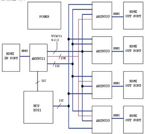 HDMI(高清晰度多媒体接口)是由日立、松下、飞利浦、Silicon Image、索尼、汤姆逊和东芝7家公司成立的HDMI组织制定的专用数字视频/音频传输标准。HDMI是针对下一代多媒体影音设备所开发的传输接口,适用于数字家电的数字电视、DVD播放机、DVD录放机、PVR、机顶盒及其他数字视听产品。其最大特色是该接口可以在一根传输电缆内传送无压缩的音频信号及高分辨率视频信号。随着带HDMI接口的终端产品的增加,在酒吧和卖场等一些公共场合需要类似以前AV格式的音视频分配器产品。本文中详细介绍了如何利用ANX9011和ANX9030来设计一进四出的HDMI分配器。