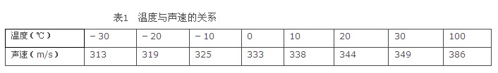 由于超声波也是一种声波,其声速c与温度有关,附表1列出了几种不同温度下的声速。在使用时,如果温度变化不大,则可认为声速是基本不变的。如果测距精度要求很高,则应通过温度补偿的方法加以校正。声速确定后,只要测得超声波往返的时间,就可以求出距离。这就是超声波测距原理。