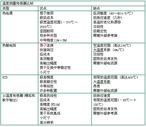 温度传感器有四种主要类型:热电偶、热敏电阻、电阻温度检测器(RTD)和IC温度传感器(见下表)。IC温度传感器又包括模拟输出和数字输出两种类型。