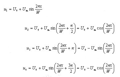 这四相电信号的后续处理过程是:首先将u1、u3和u2、u4分别两两相减,消除信号中的直流电平,得到两路相位差为90° 的信号,然后将它们送入专门的电子细分和辨向电路,可以实现对位移的测量。需要说明的是,相位差为90° 的两路信号是辨向电路所必需的,单独一路信号无法实现辨向。
