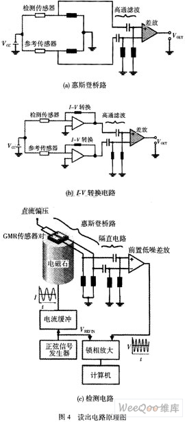 磁电阻的变化需要转化成电信号,有两种实现方式,一是惠斯登桥路结构,如图4(a)所示,另一种是采用I-V转换法,如图4(b)所示。