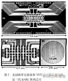 美国海军实验室于1998年率先提出利用GMR效应和免疫磁标记实现GMR牛物传感器的设想他们通过测量DNA、抗原-抗体、施体和受体等的实验,证明了其原理的可行性,从而进一步提出了磁标记阵列计数器(BARC),并研制出DNA阵列芯片图2是美围海军实验室和NVE公司联合设计的第三代BARC阵列芯片,其平面布局如图2(a)所示,图2(b)是图2(a)的局部放大,它采用半导体工艺在硅基片上集成了64路GMR传感器,每一路传感器都是由总长为8 mm、宽为1.6μm磁阻条来回曲折地分布在直径为200μm的圆形区域内(图2(c)),其磁电阻值为42 kΩ,饱和磁化强度和GMR效应(△R/R)分别为30 mT和15%,每一个传感器可以单独完成一种检测传感器采用磁性层/非磁性层/磁性层的多层膜结构,被非磁性层隔开的两个磁性层之间反平行耦合。