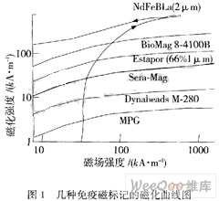 免疫磁性微球,或称免疫磁标记,是表面结合有单克隆抗体的磁性微球,是近年来国内外研究比较热门的一种新的免疫学技术它以免疫学为基础,渗透到病理、生理、药理、微生物、生化及分子遗传学等各个领域,其应用口益广泛,尤其在免疫学检测、细胞分离、蛋白质纯化等方面取得巨大的进展现在国外已经有多家公司专门生产磁标记产品,如比较著名的Dynal,Nanomag,Micromer公司等国内生产该方面产品的公司有宁波新芝生物科技股份有限公司、杭州联科生物技术有限公司、深圳纳微生物科技有限公司等图1是一些免疫磁标记的磁化曲线,其中,Dynal公司的M-280是目前最常用于GMR生物传感器检测的免疫磁标记,直径2.8μm,具有超顺磁性。