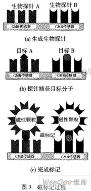 GMR传感器检测过程如图3所示首先,在传感器表面生成用于特定检测的生物探针(图3(a)),再使检测试液流过传感器表面,试液中特定的目标分子将被探针捕获(图3(b)),然后加入免疫磁性微球,免疫磁性微球与目标分子发生作用完成标记(图3(c))此时,需要采用垂直于传感器表面的外加梯度磁场将未参与标记的多余免疫磁性微球分离,这样可以减小检测时的背景噪声,从而提高检测的精确度然后,再用外加的交变磁场将磁标记磁化,磁化的磁标记产生的附加交变磁场引起传感器磁电阻的变化,通过读取磁电阻的变化可以判定待检试液中是否有目标分子,并根据磁电阻变化的幅度可以判断待检试液中目标分子的浓度等情况。