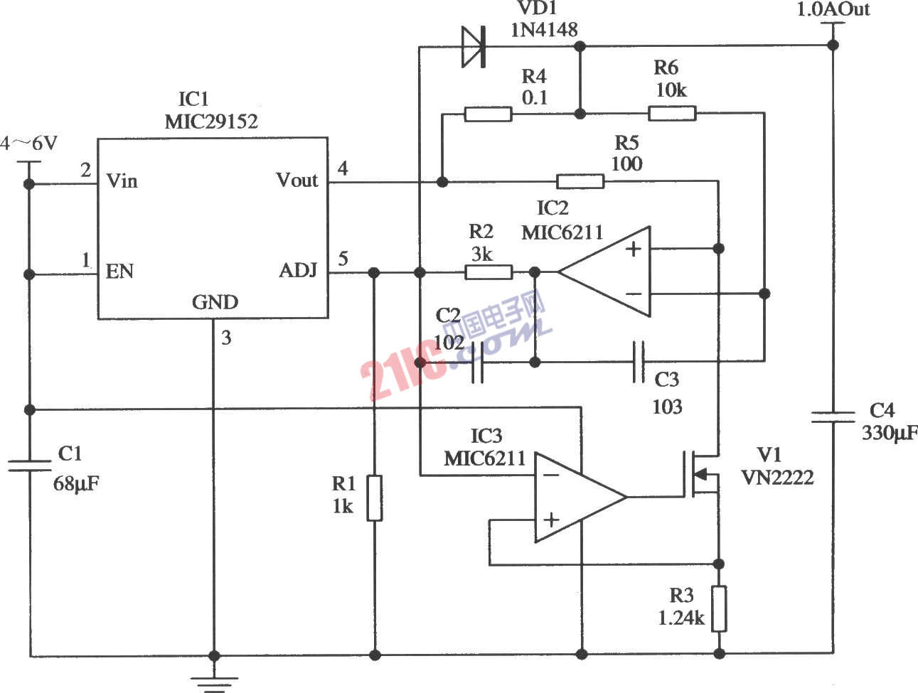 如图所示的电路是采用MIC29152和一只双运放及其他元件构成的输出电流为1.0 A的恒流源电路。这种恒流源电路对Micrel公司的所有输出可调的稳压器均适合。