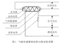 气敏传感器的两个关键部分是加热电阻和气体敏感膜。加热电阻改变传感器的工作温度, 使其工作在气体敏感的工作温度,由于外部气体的变化从而使得气敏传感器的敏感材料的电阻发生变化,金电极连接气敏材料的两端,使得它成为一个阻值随外部气体变化的电阻。