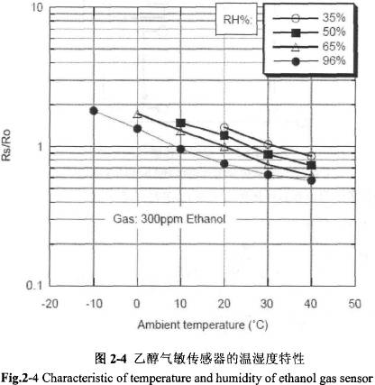 如图2-4是TGS2620乙醇气敏传感器的温湿度特性,其中Ro是20℃湿度为65[%]条件下的传感器敏感元件的电阻值,Rs为300ppm乙醇气体浓度条件下传感器敏感元件电阻值。