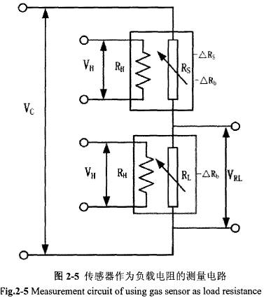 使用同型号的气敏传感器作为负载电阻,如图2-5所示。-△Rb是检测传感器与补偿传感器受温湿度等环境干扰影响导致的敏感元件电阻值的变化值。由于用于补偿的传感器敏感元件接触被测气体后同样会产生电阻值变化,因此需要设法使补偿传感器与被测气体隔绝而只感受环境的变化。