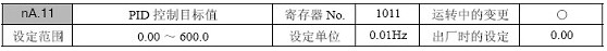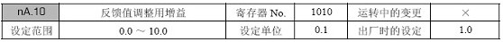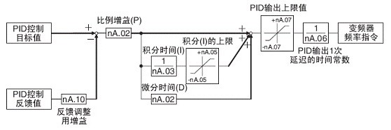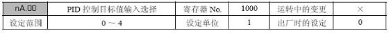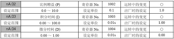 在nA.02( 比例增益) 中设定“0.0”时, PID 控制不动作。(不仅是P 控制,整个PID 控制全都无效);在nA.03( 积分时间) 中设定“0.0”时, I 控制不动作;在nA.04( 微分时间) 中设定“0.00”时, D 控制不动作。