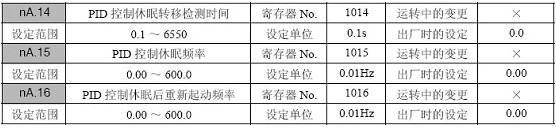 PID 控制休眠后重新起动:PID 计算结果的频率指令超过nA.16 的值时,从0Hz 开始重新起动。