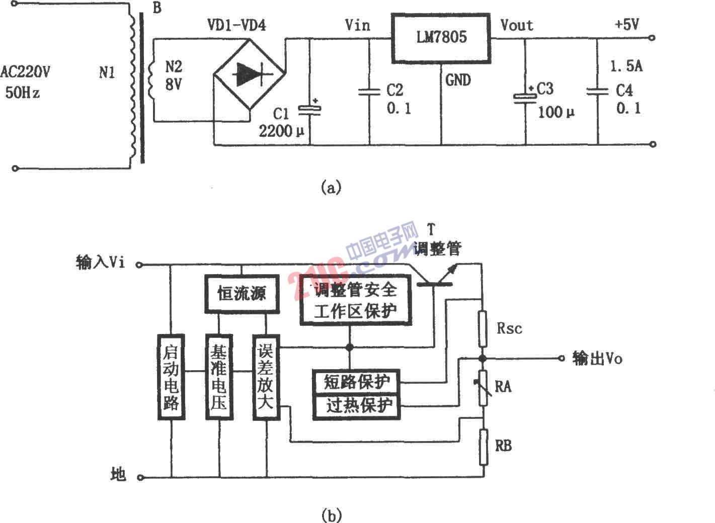 如图所示电路为输出电压+5V、输出电流1.5A的稳压电源。它由电源变压器B,桥式整流电路D1~D4,滤波电容C1、C3,防止自激电容C2、C3和一只固定式三端稳压器(7805)极为简捷方便地搭成的。
