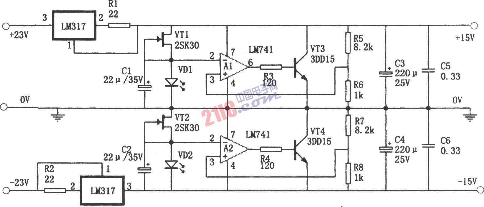 如图所示为恒流并联式稳压电源。它具有高速、低噪声、低内阻的特点。采用LM317作为恒流源,可为负载提供560mA的恒定电流。场效应管2SR3D和发光管提供低噪声的基准电压。LM741(运放)作为误差放大器,对基准电压和取样电压进行比较和放大。两只3DD15用来调整输出电压,以达到稳定输出电压的目的。