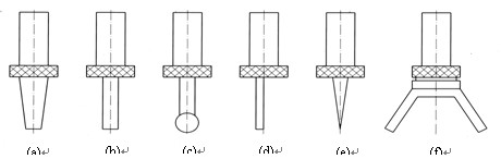 图d为半球形测端,其直径较大,用于测量粗糙表面。图e为圆柱形测端,用于测量螺纹外径和薄板。(a)球形测端 (b)盘形测端 (c)尖锥形测端 (d)半球形测端 (e) 圆柱形