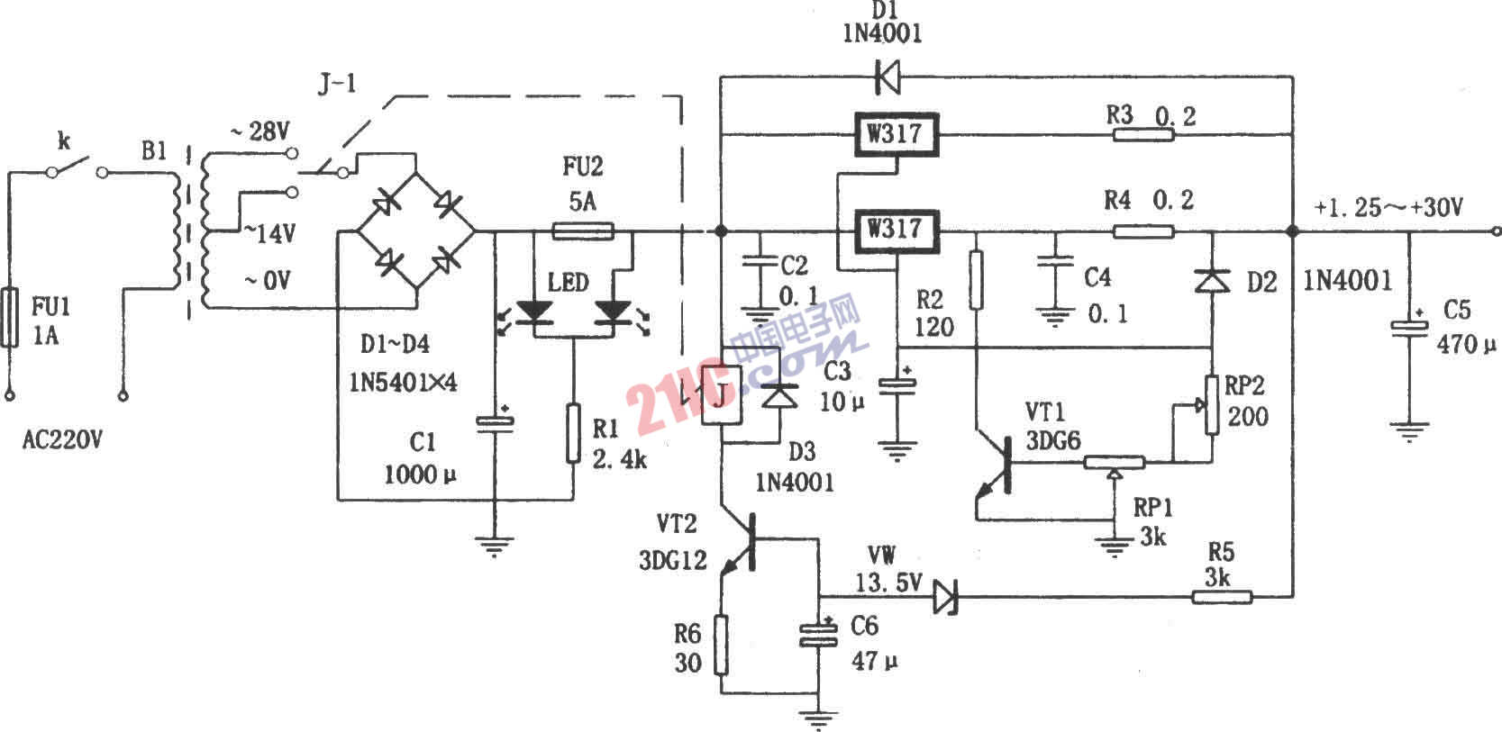如图所示为自适应可调稳压电源。本电源以LM317为稳压器件,用自适应切换电路根据输出电压的高低自动切换输入电压,以减小输入与输出电压的压差,降低电源本身的功耗。其中VT2、VD5、VW、R5、R6、C10及继电器K构成自适应切换动作电路,当输出电压Vo低于14V时,VW因击穿电压不够而截止,无电流通过,VT2截止,K不动作,其触点K-1处于常闭状态,变压器的次级14V交流电接入稳压电路。反之,当输出电压大于14V时,VW击穿,VT2导通。K得电,K-1动作,将28V交流电压接入稳压电路。从而保证了输入与输出压差不超过15V。本电路的输出电压为1.25~30V连续可调,输出最大电流为3A。