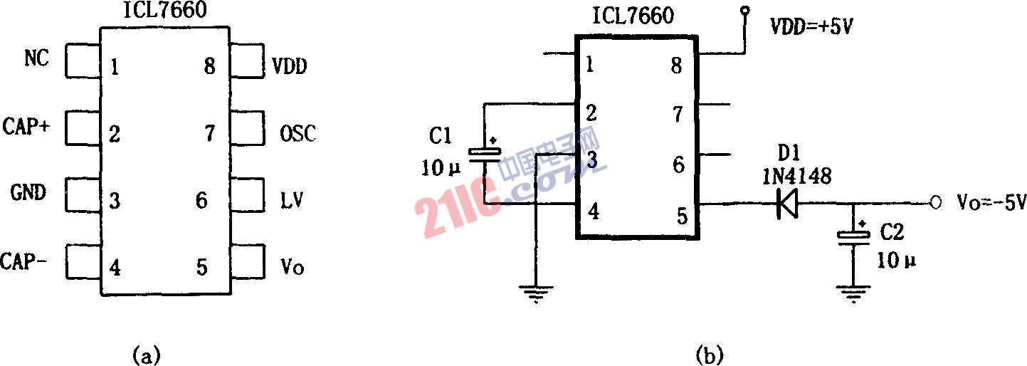 如图所示为由ICL7660和外部的两只电容组成的极性变换电源。该电源采用专用极性变换集成电路ICL7660和外部的两只电容构成的电荷泵进行DC/DC电压极性转换。其转换效率高,为95%,电能消耗小。静态电流为0.5mA,输出电流为10~20mA。