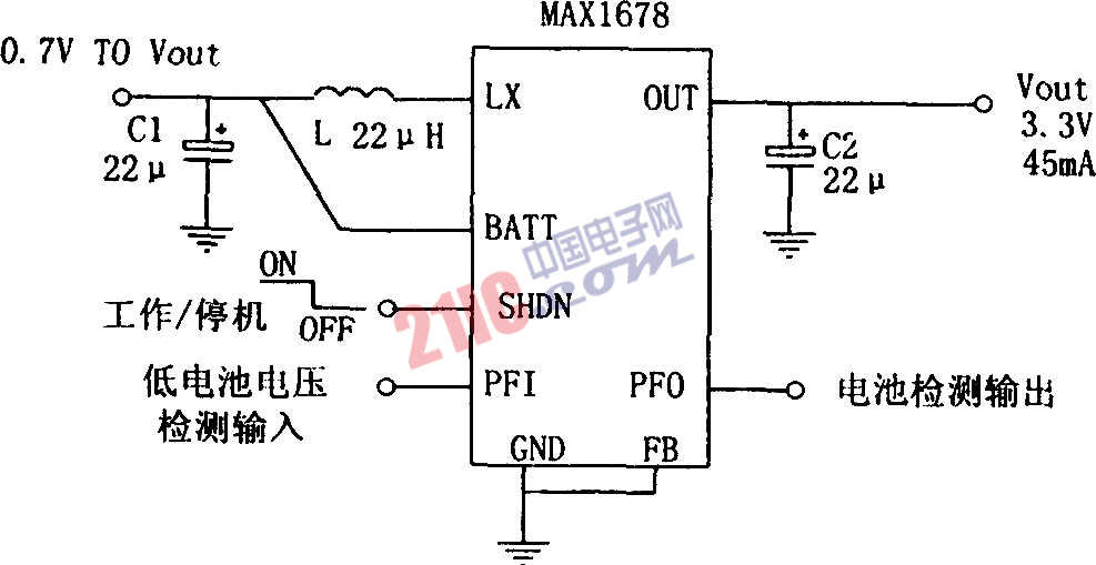 如图所示为适用于寻呼机的高效率单电池升压电源。它是由MAX1678和3只外围元件构成。MAX1678是一种专为l至2节电池供电的低功耗应用而设计的。它采用超小型8引脚,μMAX封装。不需外接MOSFET和肖特基二极管,降低了系统的成本和体积成本。芯片内部具有电池欠压检测电路、噪声抑制电路。MAX1678采用专有的恒峰电流控制原理,使其不仅保持了传统PWM转换器的低静态电流,而且具有高满负载效率及低输出电压纹波。用它组成的升压转换电源,可工作于0.7V的输入电压,输出电压预设在3.3V。其特点是:效率在90%以上;输入电压为0.85V即可启动;45mA的输出电流(1.2V升到3.3V);静态电流37μA,停机电流2μA;体积小、外部元件少、结构简单。