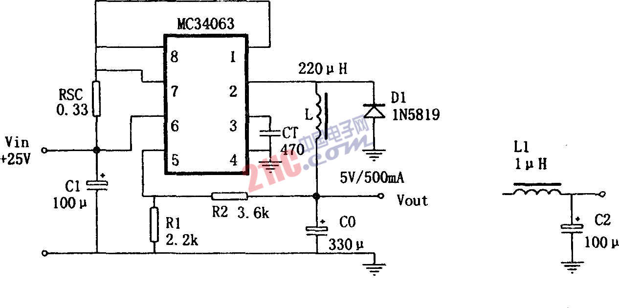 如图所示为用MC34063制作的降压变换电源。MC34063是一种开关型高效DC/DC变换集成电路。它的内部含有具有温度补偿的基准电压源、比较器、具有限电流电路的占空比可控的振荡器、驱动器和大电流输出开关管。用它制作的+25/+5V降压变换电源如图所示,其特点是:(VIN=25V,Io=500mA时)线性调整率为12mV±0.12%;负载调整率为3mV±0.03%;纹波电压为120mV。如果加一级滤波器(如图中所示)输出纹波降为40mV;变换效率为82%;短路限制电流为1.1A。