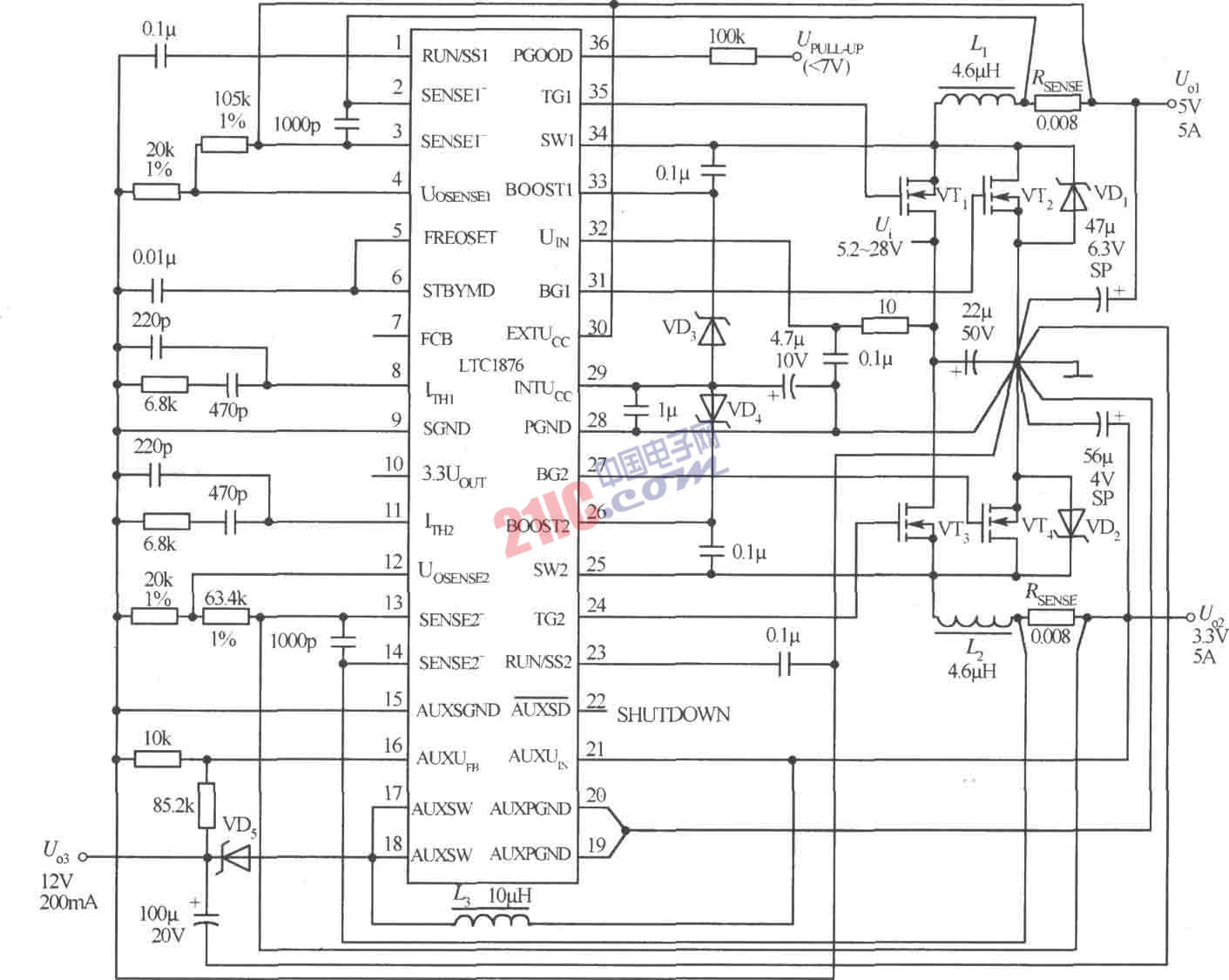 VT1~VT4:FDS6912A;L l,L2:SUMIDA CEPl23-4R6;L3:SUMIDA CDRH5D18;VDl,VD2:MBRMl40T3;VD3,VD4:BATS4A;VD5:CMDSH-3。
